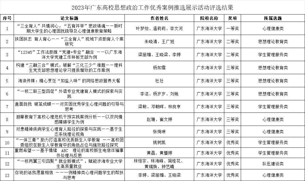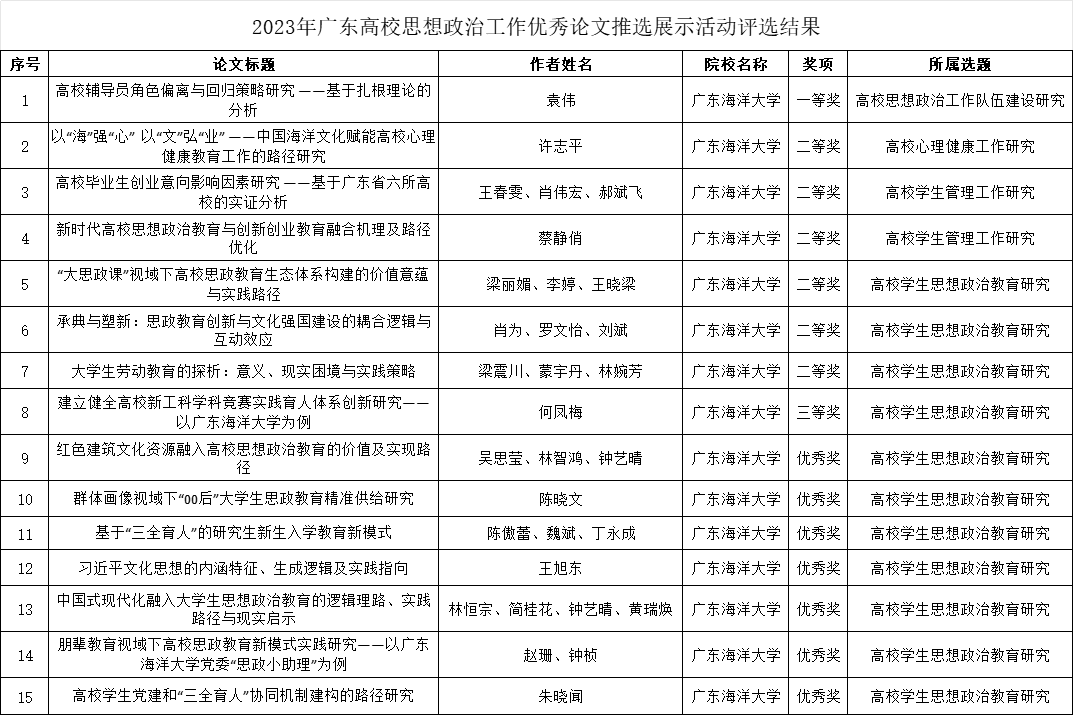 3月26日,由高校思想政治工作队伍培训研修中心(华南师范大学)组织开展的2023年广东高校思想政治工作优秀论文、优秀案例推选展示活动公布了评选结果。我校共有28个作品获奖,其中一等奖2项、二等奖8项、三等奖7项、优秀奖11项。