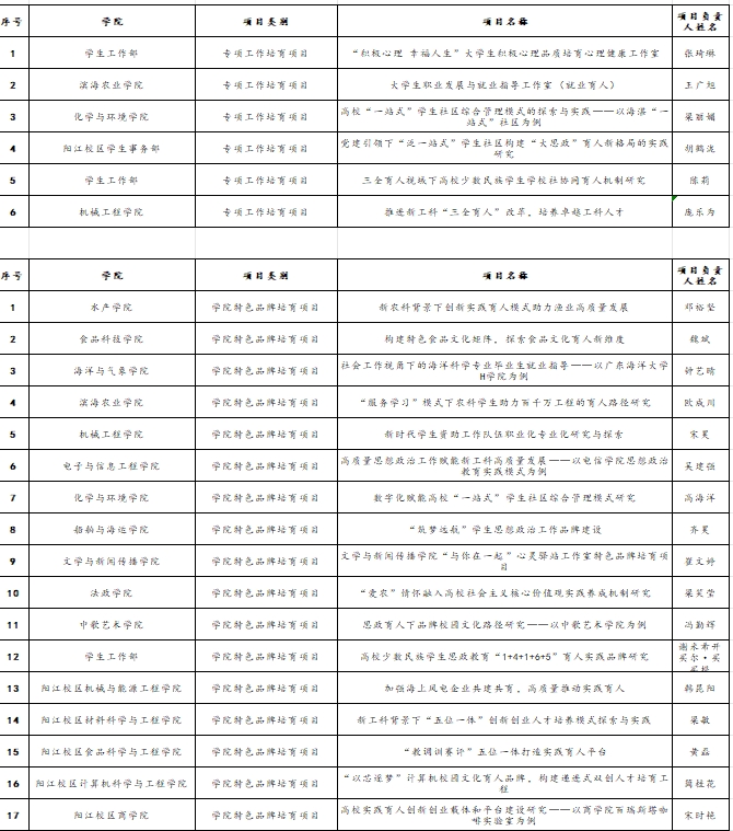为进一步做好学生思想政治教育工作,培育一批专项工作培育项目、学院特色品牌培育项目,根据《关于组织申报2024年学生工作项目的通知》(校学生〔2024〕18号)要求,经个人申报、学院推荐和专家评审等程序,拟对2024年学生工作项目中的专项工作、学院特色品牌等23个项目进行立项(名辅导员工作室立项另行公示),现公示如下: