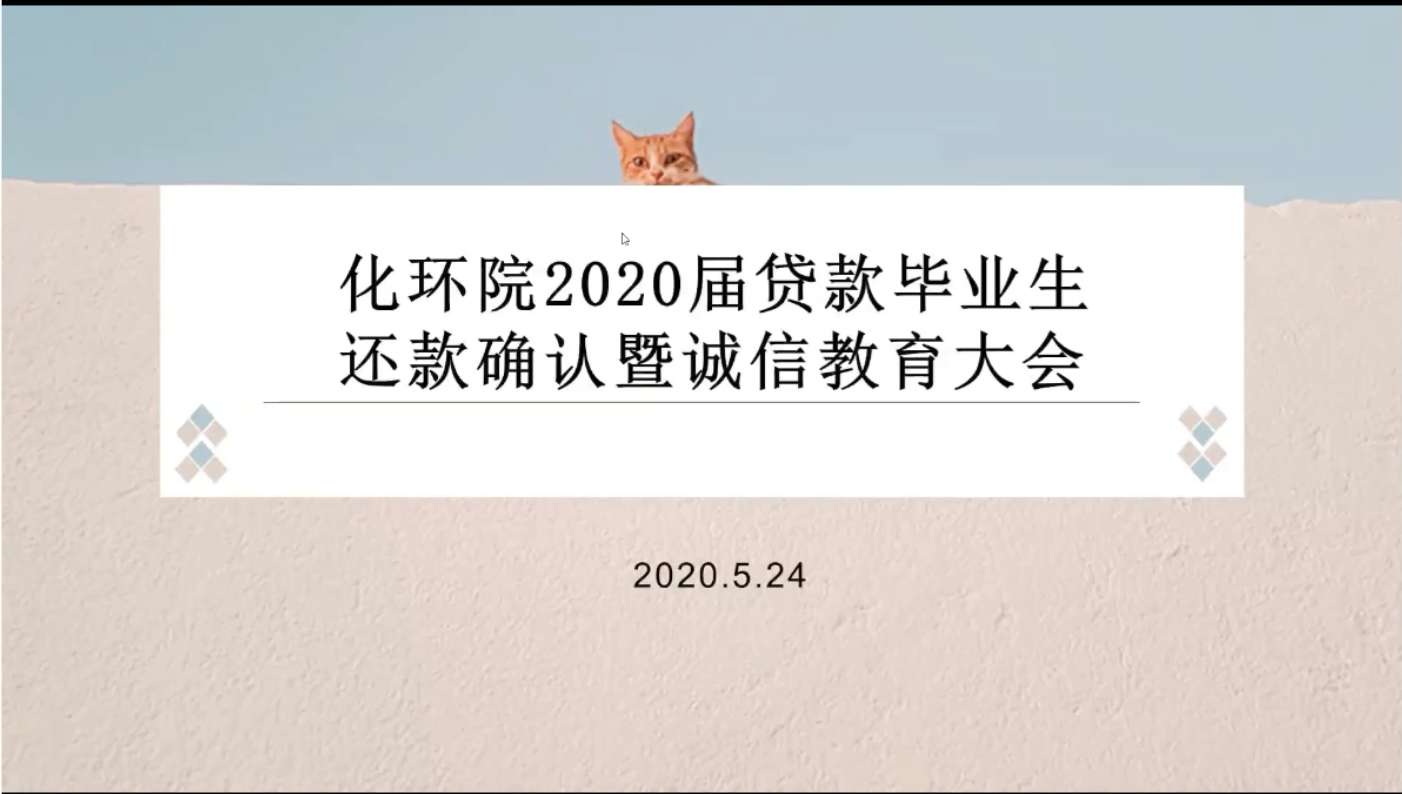 2020年5月24日晚,化学与环境学院在腾讯会议上召开了2020届贷款毕业生还款确认暨诚信教育会议。奖助贷专项负责老师罗少杰、化学与环境学院团委学生会勤工部各成员、2020届贷款学生共38人参加会议。此次会议由赵志敏主持。