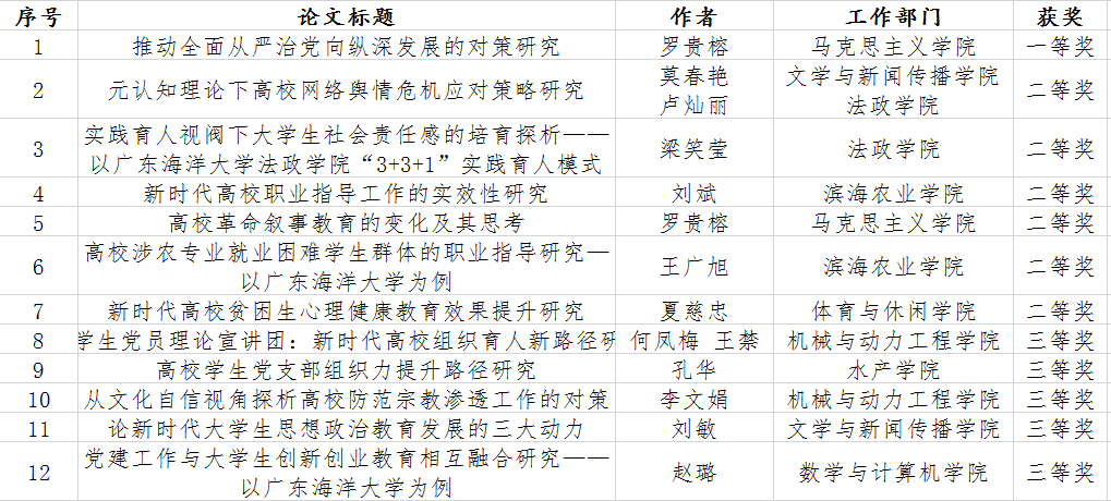 为推进高校思想政治工作队伍的专业化和专家化,促进高校思想政治工作者进行理论学习和科学研究,高校思想政治工作队伍培训研修中心(华南师范大学)、教育部高校辅导员培训和研修基地(华南师范大学)、广东省高等学校思想政治教育研究会、《广东教育》(高校思想教育探索)编辑部联合开展了高校思想政治工作优秀论文征集活动。我校选送的12篇论文全部获奖,其中一等奖1项、二等奖6项、三等奖5项。