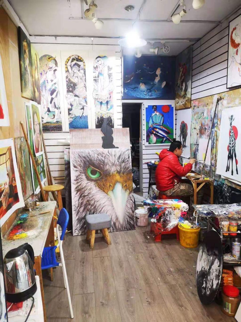 走进大芬油画村,首先映入眼帘的是色彩丰富的艺术作品和具有艺术特色的建筑陈设。团队在沿着街道进行参观和拍摄工作过程中,将所见所闻与出发前收集到的资料进行了比对,对大芬村的全貌和具体情况形成了更加深刻的认识。在与村中居民的聊天中队员们了解到,大芬油画村的发展与政府的帮扶和引导息息相关:政府因地制宜,发展中坚守地方特色,在环境改造时保留了原本的客家排屋古建筑整体形式,大力推广大芬村油画,并以此形成的独特历史文化氛围。在走访中分队还了解到,现今已有上千名的艺术家在大芬村扎根生活。受访的艺术工作者纷纷表示,近十几年来,靠着政府有力规范当地油画市场的发展,大芬村已经打造出“专有线上平台交易-绘画-装裱-运送”的配套服务,并形成了游客参与体验、学徒培养的的可持续发展模式。在政府的主导和支持下,这些艺术工作者也愿意将时间和精力投入到大芬村这一个“家”中,运用自己的能力携手地方政府共同建设一个名副其实的大芬油画村。在大芬美术馆,队员们正好赶上第二届深圳大芬国际油画双年展在此举办,现场工作人员不仅向分队作了活动和作品的讲解,同时以此为切入点还介绍了大芬村的发展历史以及改革开放过程中当地政府为推动大芬油画“走出去”所采取的一系列措施,如举行油画展览、支持原创作品等。