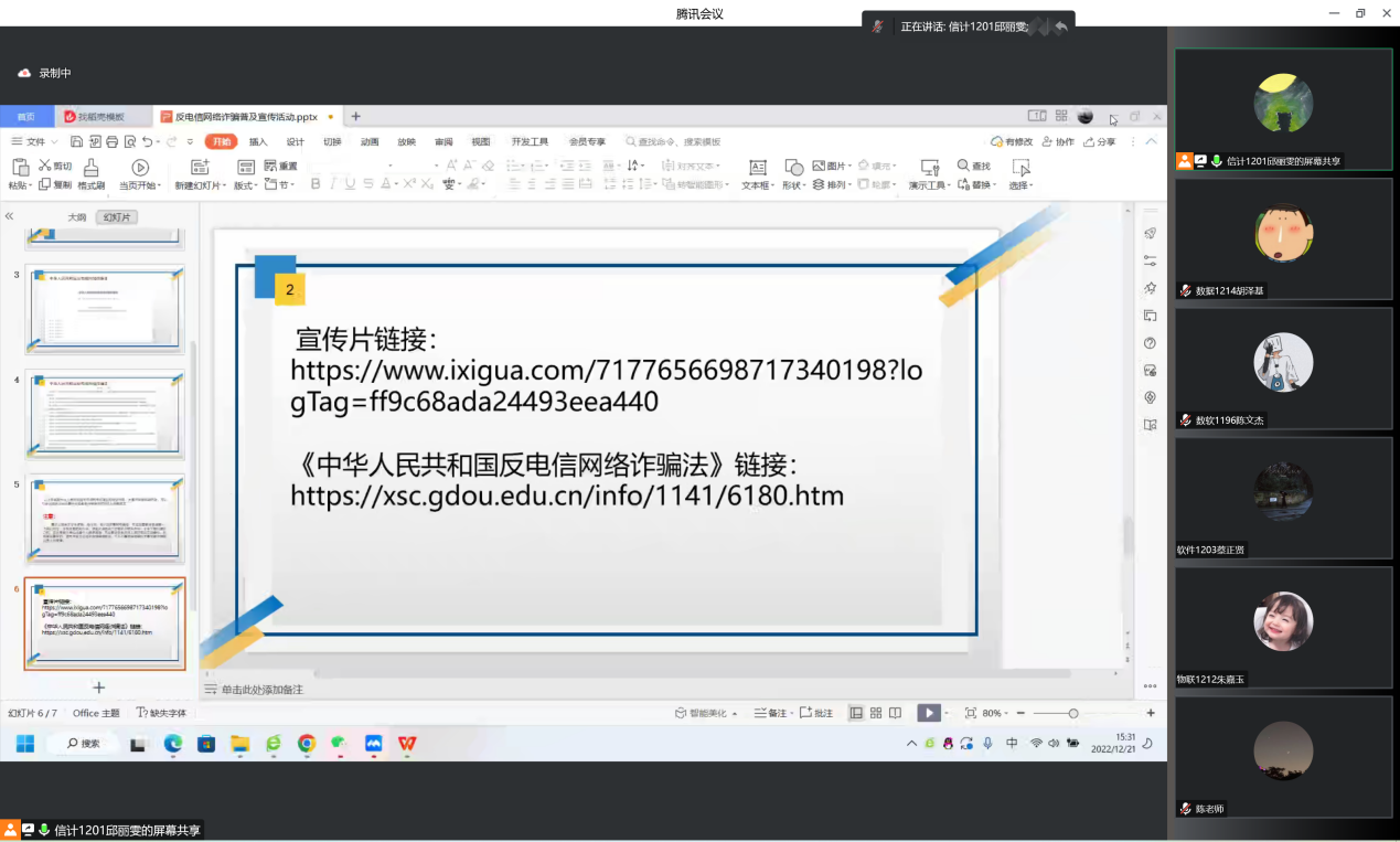 会上,邱丽雯同学详细为大家解读了《中华人民共和国反电信网络诈骗法》相关条款,普及了电信网络诈骗知识,她结合最近校园出现的事关学生资助、助学金、助学贷款等网络骗局,提醒同学们高度警惕。她向同学们传达了学校的相关要求,即学校所有奖励资助工作均由老师和学生干部负责组织,不会安排学生在网上进行双向互动操作;如有类似情况需首先向分管辅导员、班主任咨询,千万不要擅自按照对方要求操作转账,以免上当受骗。