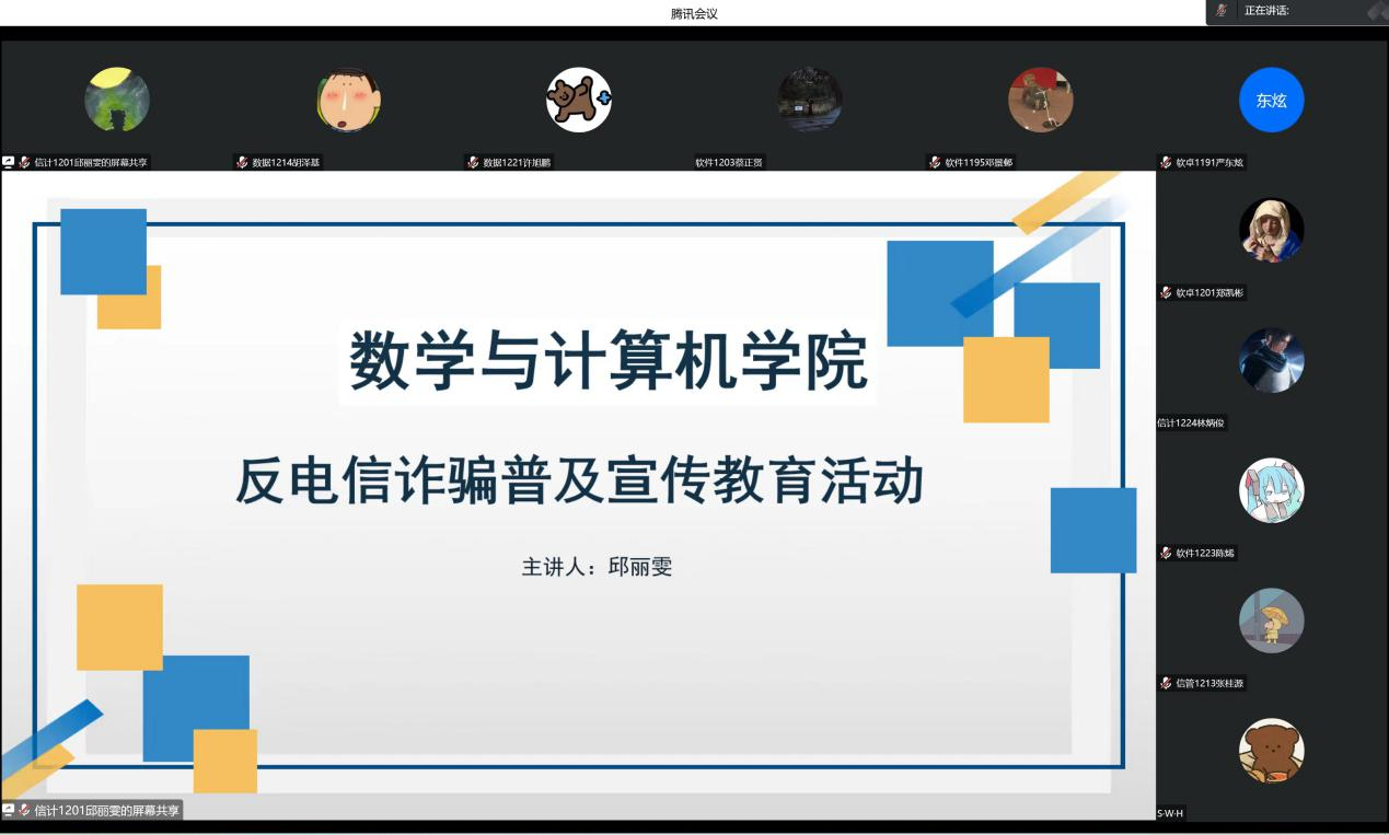 为增强家庭经济困难学生反诈骗意识,提高学生反诈骗能力,数学与计算机学院积极响应学校号召,于12月21日下午开展了反电信诈骗宣传普及教育活动。活动由学院分管学生资助模块专员陈荣宁老师组织,学生春晖宣讲团成员和全院被认定为家庭经济困难学生共265人参加。