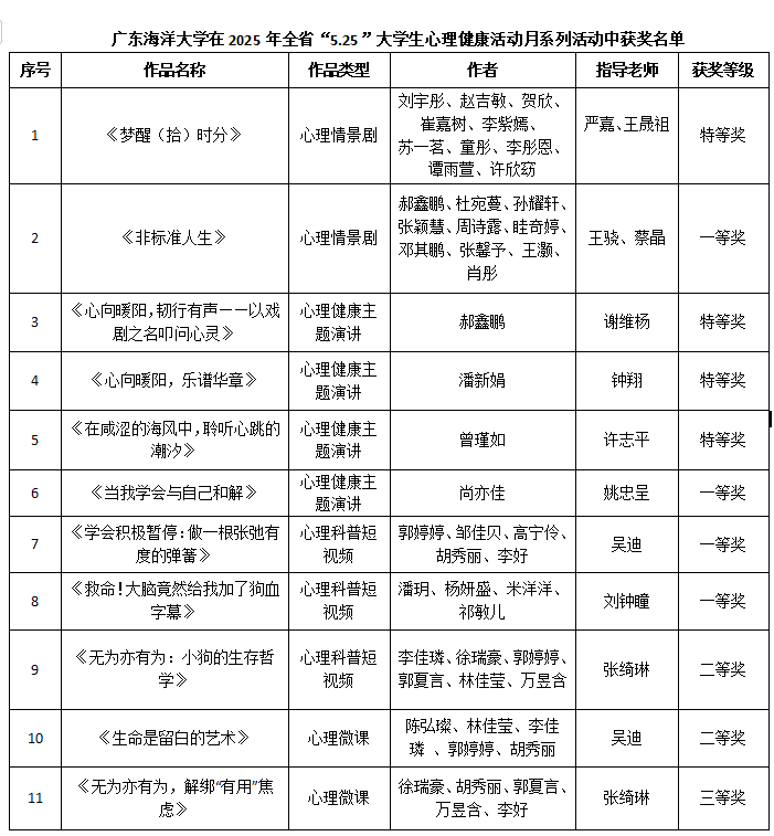 近日,从广东省教育厅传来喜讯,在2025年“5•25”大学生心理健康月系列活动评选中,我校师生在大赛中表现突出,共荣获特等奖4项、一等奖4项、二等奖2项、三等奖1项的优异成绩,获奖总数和质量均位居省内高校前列,充分彰显了我校心理健康教育工作的卓越成效与学子积极向上的精神风貌。